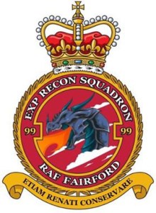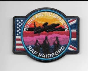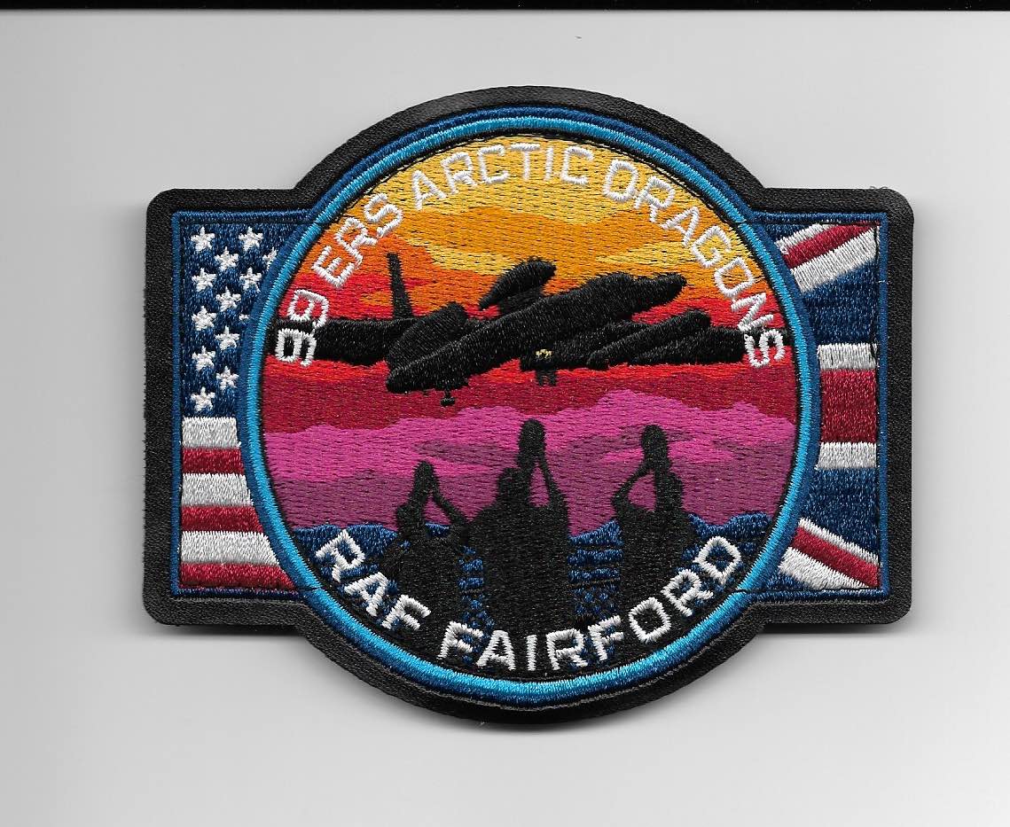 Being a British airbase, Fairford is often surrounded by aircraft enthusiasts observing the action with their radios and photo equipment. The personnel of the 99th ERS obviously have a sense of humor. They have designed their informal ‘Friday’ patch and the ‘pencil pocket’ patch that is worn on the arm of their flightsuits, to show long camera lenses poking over the base fence! The formal 99th ERS patch features a fiery dragon (of course), and is topped by a crown to acknowledge the British basing.